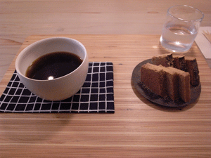 写真は私が注文した 湯割(ユワリ) と 黒糖パウンド 深煎きな粉がけ です。